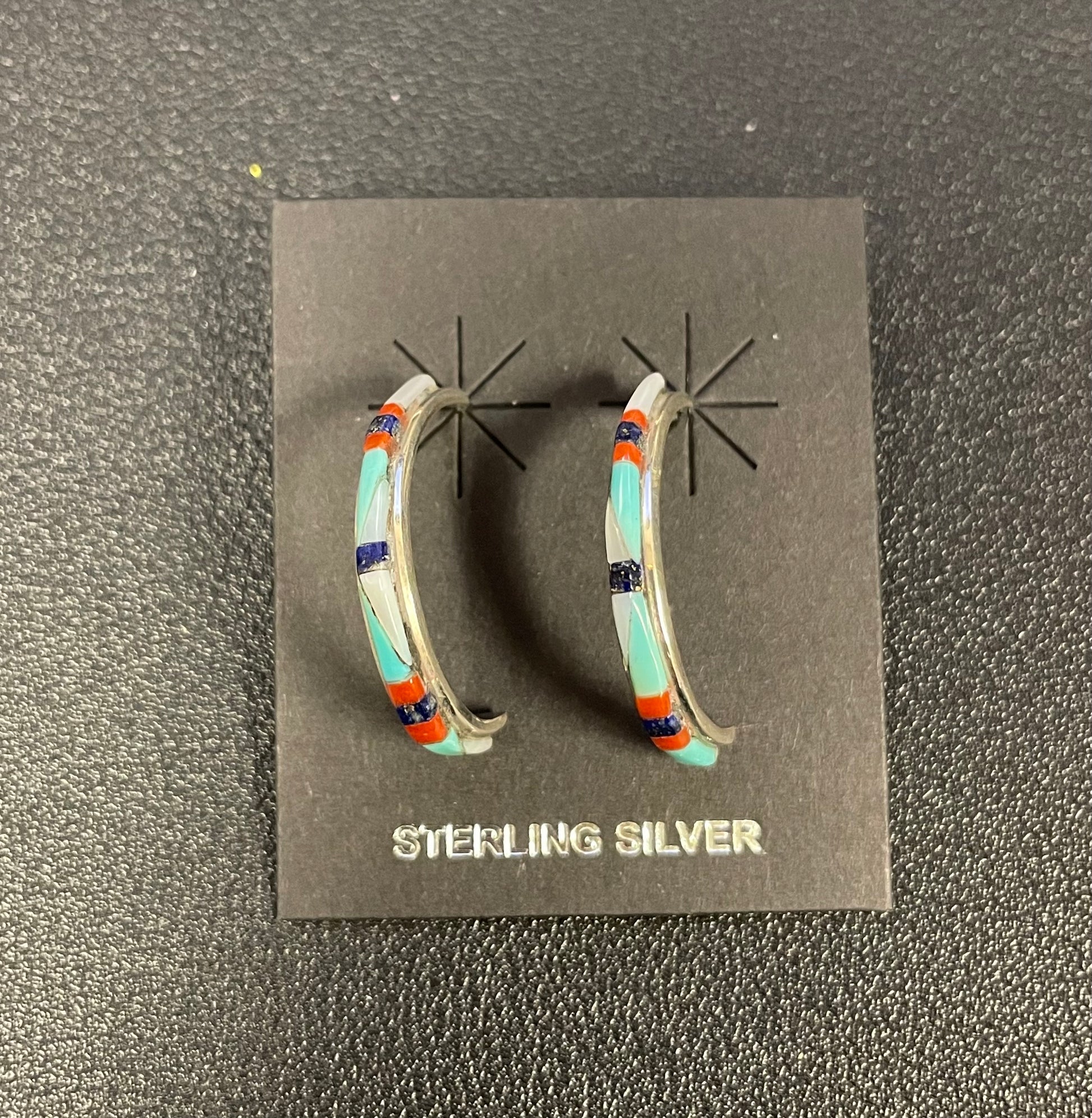 Multi-stone (turquoise, coral, opal) patterned semi hoop earrings by Chaveris. Sterling Silver. Indigenous Handmade.