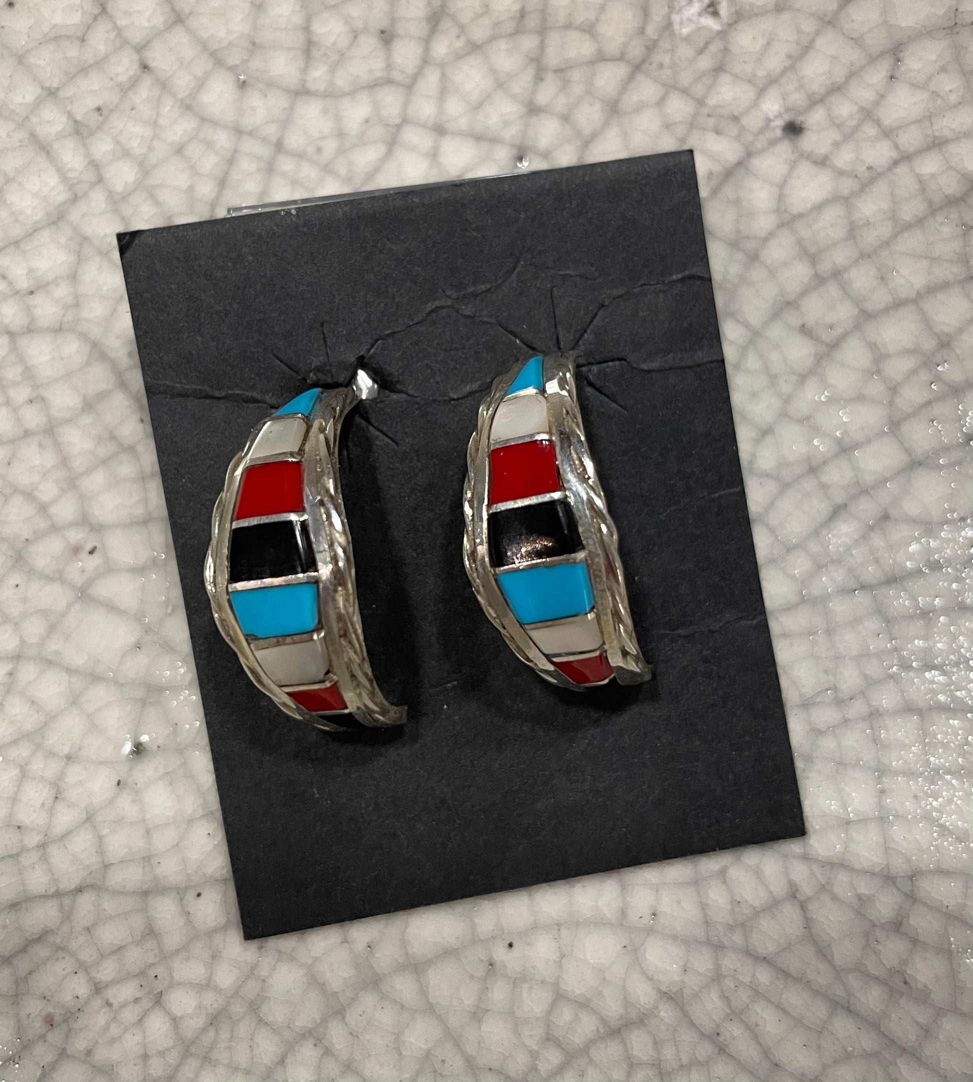 Zuni 1" Inlay Hoop Earrings - Indigenous Handmade - Sterling Silver & Multi Stone Earrings